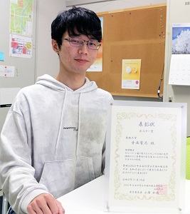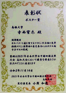 2021年11月13日および14日に開催された、2021年日本化学会中国四国支部大会 高知大会において、物質化学コース博士前期課程1年生の寺西宥太さん(指導教員:飯田拡基准教授)が「ポスター賞」を受賞しました。寺西さんは、天然由来のビタミンB₂誘導体とメラミン誘導体が有機溶媒中で集合して精密なナノ構造を形成し、ゲルを生成するユニークな現象について発表しました。得られたゲルは、医薬品やファインケミカルに広く用いられる鏡像関係にある分子を簡単に見分けることのできるソフトマテリアルとして、今後の応用が期待されています。本研究は、近年の国際目標であるSDGs(持続可能な開発目標)の実現を目指す試みのひとつとして実施されたものです。