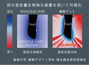 高齢者や子供の住宅内での転倒事故に対し、怪我の程度を低減する緩衝性能を持たせた畳床を、積水成型工業株式会社との共同研究により開発しました。この畳に採用された緩衝構造は、板材と緩衝材の適切な組み合わせについて研究した成果により得られたものであり、薄型でありながら高い緩衝性能を発揮します。また、畳に荷重がかかった際の局部的な変形を抑制することで、歩行にも影響しにくいものとなっています。