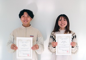 2022年11月12および13日に広島大学で開催された、2022年日本化学会中国四国支部大会 広島大会において、物質化学科4年生の熊谷優志さんと村尾舞妃さんがそれぞれ「ポスター賞」を受賞しました(指導教員:飯田拡基准教授)。熊谷さんは、天然由来の機能性有機分子であるビタミンB2誘導体が、有機溶媒中でメラミン誘導体と自動的に組みあわさって高次構造体を形成する現象とその構造について発表しました。また村尾さんは、地域資源であるカニ殻からとれる天然高分子のキトサンと、ビタミンB2誘導体をハイブリッド化させた触媒について発表しました。これらの研究の一部は、近年の国際目標であるSDGs(持続可能な開発目標)の実現を目指す試みの一端として、本学のSDGs ・カーボンニュートラル推進プロジェクトの支援を受けて実施されたものです。