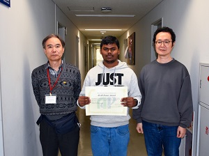 Raj Deepさんは次世代の発光ダイオード(LED)として期待される酸化亜鉛(ZnO)のナノ粒子を塗布して作製した紫外線LEDと蛍光体を用い、太陽光に近い演色性の優れた白色LEDの特性について発表しました。Raj Deepさんの発表は世界中の研究者がなしえなかった安定なp型ZnOの合成からデバイス化まで一貫して行った成果が評価され、676件のポスター発表の中から「Poster Award」に選ばれました。