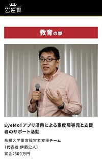 総合理工学部の伊藤史人助教が、公益財団法人岩佐教育財団が主催する第2回SDGsジャパンスカラシップ岩佐賞を「教育の部」で受賞しました。テーマは「EyeMoTアプリ活用による重度障害児と支援者のサポート活動」です。
