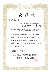 総合理工学部物質化学科(自然科学研究科物質化学コース)の飯田拡基准教授が、中国電力技術研究財団より研究奨励賞を授与されました。飯田准教授のグループでは、近年の国際目標であるSDGs(持続可能な開発目標)の実現を目指す試みのひとつとして、環境負荷の低い有機合成技術を開発することを目標に研究を行っています。本賞は、その一端である「電力で駆動する有機分子触媒を用いたクリーンな酸素酸化反応の開発」であげた研究成果が評価されたものです。