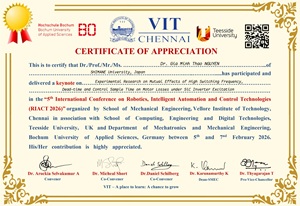 2026年2月5日~7日まで、総合理工学部機械・電気電子工学科のNGUYEN Gia Minh Thao准教授は、インドとアジアのトップ大学の一つであるベロール工科大学で開催された The 5th International Conference on Robotics, Intelligent Automation and Control Technologies (RIACT 2026)において、基調講演者の一人として登壇しました。